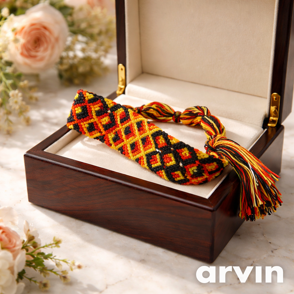 Ce bracelet brésilien tissé à la main se distingue par son motif géométrique dit ananas, composé de losanges colorés parfaitement imbriqués. Les couleurs vives et contrastées créent un rendu joyeux et dynamique qui attire immédiatement le regard.